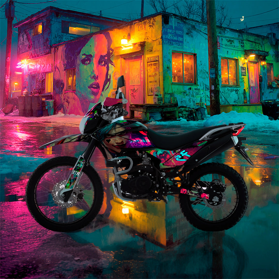 Cuando el arte callejero se vuelve peligroso y la locura ilumina la ciudad, nace Toxic Voltage Crew, el kit de calcas premium que convierte tu moto en un arma visual diseñada para dominar la noche.